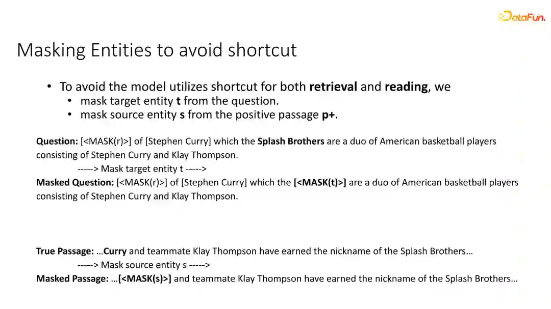为了避免模型仅仅通过一些简单的词语就找到准确答案,需要从问题和段落当中去掩盖掉目标实体P以及提及实体S。具体来说,我们在question当中选取出了T2S很有可能就包含了目标答案,在这种情况下,仅通过我们找到重要的答案,模型可能就能够知道答案是什么。因此我们必须从question中把target entity T给去掉。同理,我们在true passage中为了防止只根据source entity就能找想要的passage,我们也需要将source entity从true passage中给mask掉。