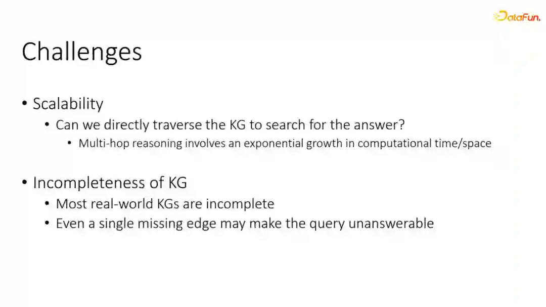 第二个非常明显的一个问题,即大多数knowledge graph是不太完整的。因为它不太完整,当我们在问题中包含的某个relation在KG当中不存在的时候,这一类的query就完全没有办法被回答。