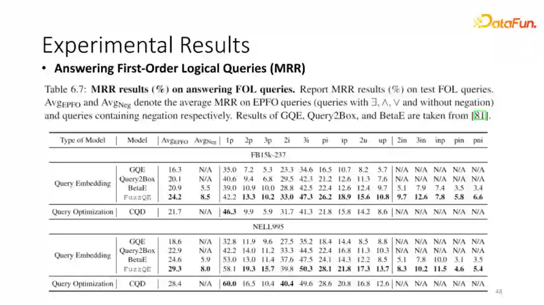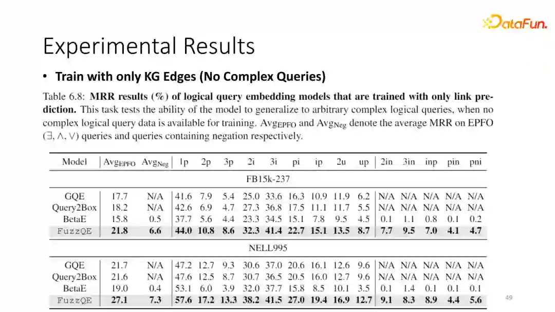 为了验证我们模型的表现,我们首先在标准的数据集上,也就是包含了很多complex fol query的数据集上进行训练。可见 fuzzy logic query embedding 的结果相较于之前的 query embedding 工作有非常显著的提升,并且它与best paper就是耗时较长的CQD paper也有非常接近的结果。同时,我们可以解决包含在内的所有的逻辑操作。