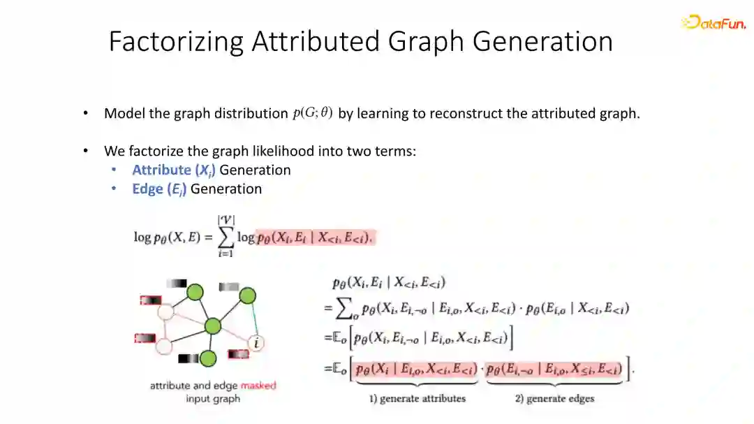 我们提出了一种介于中间的分解方式,引入了一部分已经观测到的边,假设在任何一个新的节点中,可能会有一部分边已经被观测到。比如说它本来有十条边,我们可能已经观察到其中的三条,然后将生存的概率分解成两部分:一部分是基于已经观测到的边来去预测它的attribute,第二部分是基于已观测到的边和attribute两部分预测剩余的一些连边信息。通过随机选取可能已经观测到的边,我们就能够获取每个节点的attribute以及它的连边之间的依赖。