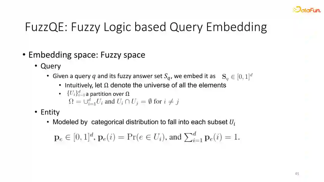 我们将每一个查询语句和对应的答案集合预设为Sq,也就是一个向量,其中的每一个元素被映射在零到一之间,从而方便进行fuzzy logic 的operation,而每一个实体是否属于其中某一个集合,我们可以表征为一个embedding和Sq之间相似度,也可以被表征为一个概率。