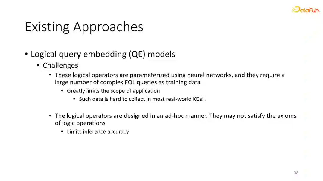 第一,在所有这些快query embedding工作中,每一个logical operation都是被特定的neural network建模的,并且它也有对应的一些参数,那么为了训练好每一个对应的logical operation,他们需要有非常大量的、准确的complex first of logical queries作为训练数据,才能够得到非常准确的逻辑推理,这极大地限制了这类工作在真实场景里面的应用,毕竟在真实的数据集里面,很多情况下并不会拥有这么多的准确的first of logical queries。