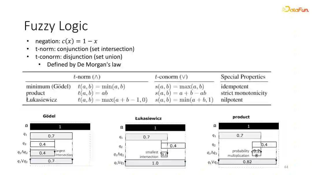 基于这一些challenge,我们提出了一个 fuzzy logic 新的 query embedding 模型。这一模型借鉴了 fuzzy logic 的基本操作来实现逻辑运算,且这些操作没有我们不需要的任何的额外参数,意思就是说我们再去进行逻辑运算的时候,我们是不需要额外的标注数据来进行学习的,只要模型的 entity embedding 和 relation prediction 足够好,就可以直接进行任何复杂逻辑推理。