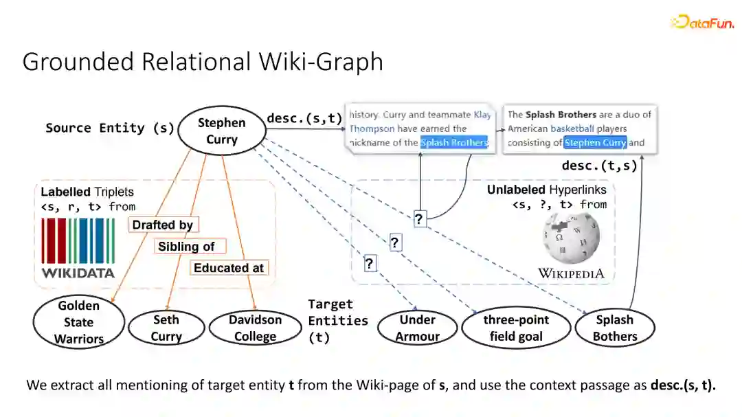 第一步是将WIKIDATA和WIKPAGE两部分耦合在一起,生成一个WIKIGRAPH,其中WIKIDATA包含了很多的triplets,而WIKPAGE包含了一些triplets没有relation的hyperlinks以及对应的文本。 在这个图当中,任意两个节点的关系可能是来自Wikipedia的标注,也可能来自WIKPAGE无标注的超链接。对每条边,我们可以从起始节点的WIKPAGE当中找到目标节点的一些描述。比如在Stephen Curry和Splash Bothers之间的连边当中,我们就可以将从Stephen Curry中找到哪些句子出现了Splash Bothers,而这个句子当中的一些context信息其实在某种意义上包含了一些描述两个实体之间关系信息。同理,我们也可以从target entity比如说Splash Bothers的页面当中找到有关于Stephen Curry的一些描述,而它前后的一些context也同样包含了他们两个之间的关系。我们将这一类从起始页面找到的对目标实体的描述称为description S2T,反之称为description T2S。基于这一WIKIGRAPH我们就可以去生成关系型的问题。