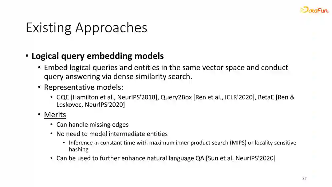 传统的方法通常是采取在知识图谱上进行游走的方式来搜索最终的答案,但这种方法会有两类很明显的问题:一类是时间消耗非常大,尤其是对于一些关系和节点数非常多的知识图谱,随着query长度增加,游走的时间开销是指数级增长的。