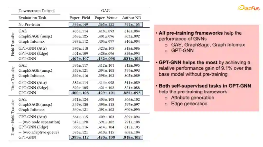 利用这一目标进行预训练初始化的图神经网络,对比它在迁移到下游任务时和其他的自监督学习的一些方法,比如和Graph Infomax和GraphSAGE一些对比,我们可以明显看出,基于重构的生成式模型的损失提升还是非常显著的。尤其和完全没有训练的baseline对比,平均取得9.1%的提升。