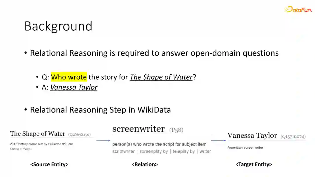 大背景是很多开放式问答需要合理的建模实体之间的关系知识,从而获得准确答案。例如,当我们想要回答哪一位作者写了《水形物语》这本书的时候,我们需要从问题当中的writer这个词来准确地捕捉到这个问题,其实想要问的是书和它的作者之间的关系。