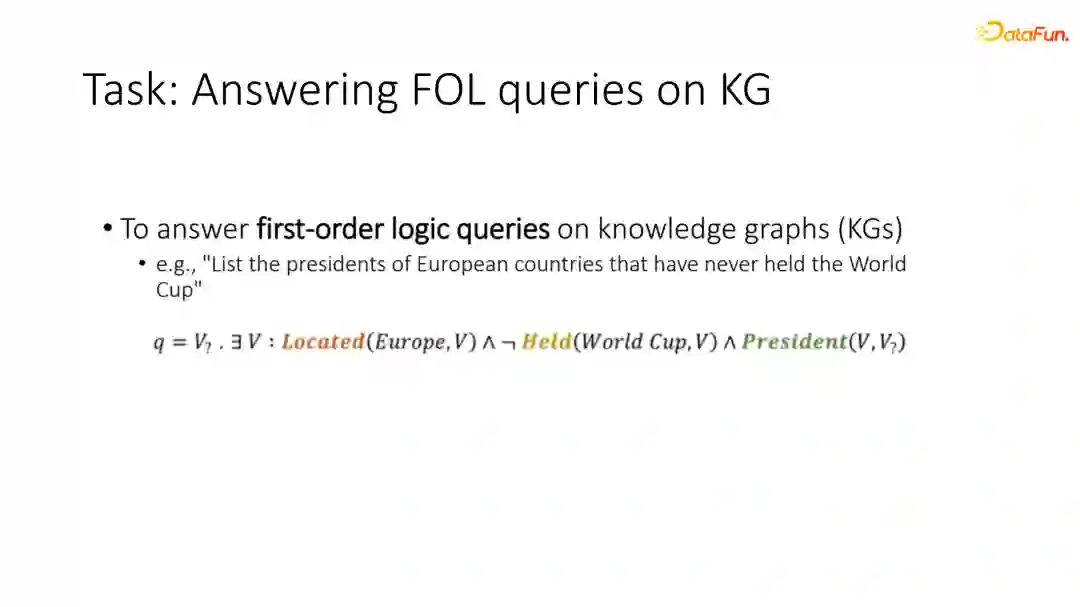 我们想解决的问题是在知识图谱上进行一阶逻辑的推理。例如一个问题是:列出所有从未举办过奥运会的欧洲城市的总统。为了完成这一查询句,除了要准确地进行关系建模,也就是我们上一节工作想要处理的问题以外,模型还需要进行一些逻辑操作,例如与或非。