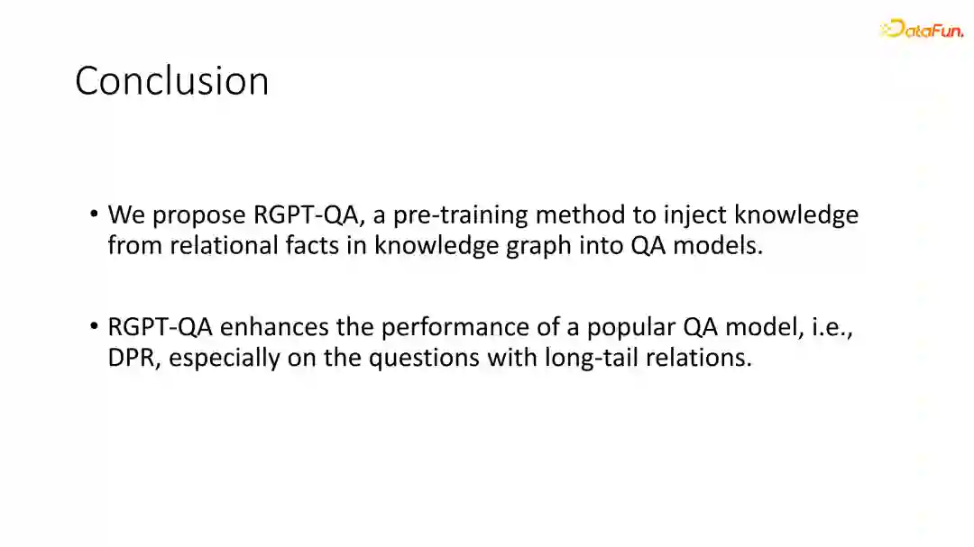 作为总结,在这个工作当中,我们提出了一个可以将知识图谱当中的关系型事实注入到问答模型的一种预训练方式,这一方法在提升整体问答系统性能的同时,能显著提升那些出现非常少的关系的问答的结果。