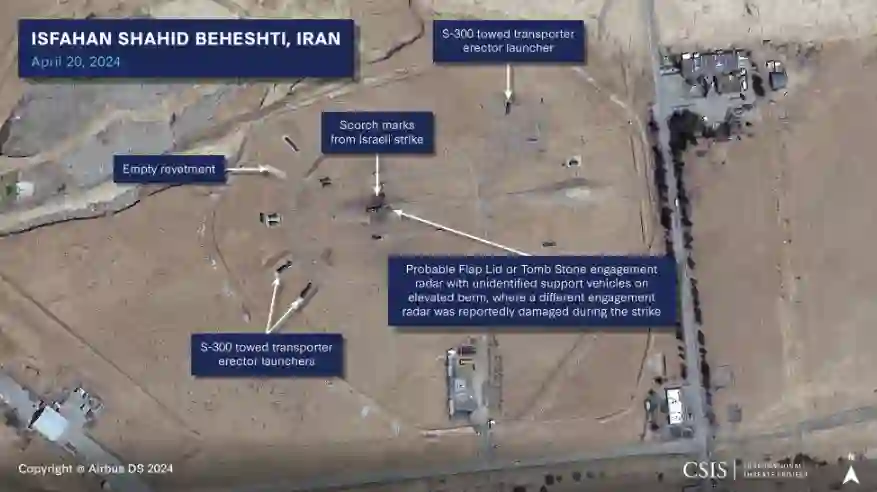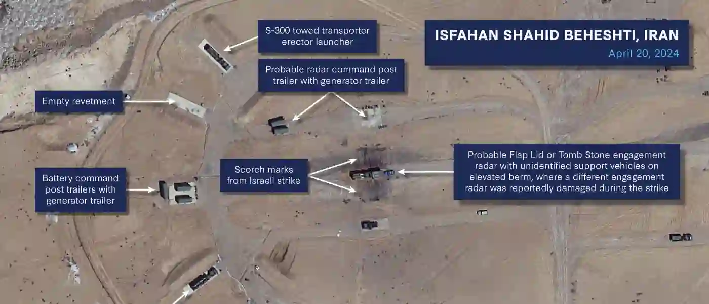 在伊斯法罕造成的破坏规模很小,足以避免这种政治愤怒。这次袭击可能只摧毁了一个 30N6 "襟翼盖 "或 30N6E "墓石 "交战雷达。虽然这比以色列在 4 月 13 日遭受的损失更大,但该系统是可以更换的。卫星图像显示,交战雷达通常所在的位置遭到了破坏。但伊朗似乎在袭击后一天内就更换了受损雷达,尽管商业卫星图像不足以确定该系统是否仍在运行,或者伊朗是否用 96L6E Cheese Board 早期预警和捕获雷达更换了交战雷达,这将使该地点无法运行,同时使德黑兰能够声称袭击没有造成任何损害。