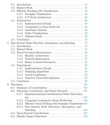 第三,我们提出了一种新颖的用于高效单物体视觉跟踪的变换器层。我们证明了实时单物体追踪器的性能可以在不影响延迟的情况下显著提高,同时始终优于其他变换器层。最后,我们研究了适应利用点检测和描述神经网络用于计算能力有限的平台的有效性。我们发现,网络组件的混合精度量化,结合二元描述符归一化层,可以在性能稍有下降的同时,至少提高一个数量级的稀疏3D地图的大小、匹配速度和推理速度。总结来说,这篇论文关注的是在计算限制下设计深度神经网络。随着对高效深度网络的兴趣和需求的增加,我们预见所提出的工作将为更高效的方法铺平道路,弥合与性能更好的替代方案之间的差距。