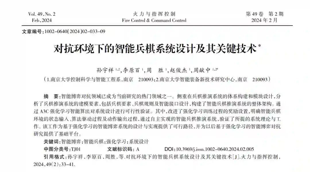 近年来人工智能技术突飞猛进,尤其在智能 博弈对抗领域取得了一系列的关键进展。2016 年,AlphaGo 与李胜石进行了一场万众瞩目的围棋 大战,最终人工智能 AlphaGo 以 4∶1 的结果完胜人类,一时间掀起了社会上的广泛热议,推动了人 工智能技术的又一次发展浪潮[ 1-2]。随后,AlphaGo 的研制团队 DeepMind 趁热打铁,在《星际争霸》游 戏上进一步取得明显突破,研制成功 AlphaStar[3]。 中国腾讯 AI Lab 利用深度强化学习技术,在《王 者荣耀》游戏虚拟环境中构建“觉悟 AI”,开发高 扩展、低耦合的强化训练系统,使得“觉悟 AI”能 够具有进攻、诱导、防御、欺骗和技能连续释放的 能力[ 4]。 智能博弈系统虽然取得了显著成就,但是依然 有很多问题亟待进一步研究。虽然人工智能的概念 早在 1956 年就被提出,但是由于计算机性能的不 足以及理论基础的缺失,人工智能还远远没有达到 可以挑战人类思维的地步[5]。随着对于智能化研究 的逐渐深入,各种算法的实现以及在围棋上 AlphaGo 的出现[6-7],对智能博弈系统进行智能化研究已 经是一种趋势。智能辅助决策是制约智能博弈系统 升级换代的瓶颈问题,是一个不容忽视甚至是需要 争分夺秒去解决的问题。由于智能博弈系统特点, 深度学习和强化学习的算法效果依然有很大的提 升空间。这里以最经典的博弈系统“兵棋推演”为 例,简述基于强化学习的智能博弈系统的构建思路 及仿真验证。 本研究设计的算法模型为设计适用于复杂环 境的智能兵棋系统提供了思路:建立智能兵棋系统 通用的体系架构,并针对每个模块进行功能解释。 针对智能兵棋系统的核心模块,建立智能决策算法 模型,通过典型实验环境来验证建模思路。其中,智 能决策模型以 A3C 算法为代表的强化学习驱动,进 而从原理和实践上,验证了智能决策算法模型在智 能兵棋推演系统的可行性。