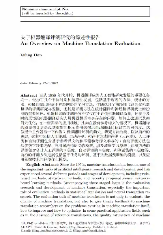 自从 1950 年代开始,机器翻译成为人工智能研究发展的重要任务之一,经历了几个不同时期和阶段性发展,包括基于规则的方法、统计的方法、和最近提出的基于神经网络的学习方法。伴随这几个阶段性飞跃的是机器翻译的评测研究与发展,尤其是评测方法在统计翻译和神经翻译研究上所扮演的重要角色。机器翻译的评测任务不仅仅在于评价机器翻译质量,还在于及时的反馈给机器翻译研究人员机器翻译本身存在的问题,如何去改进以及如何去优化。在一些实际的应用领域,比如在没有参考译文的情况下,机器翻译的质量估计更是起到重要的指示作用来揭示自动翻译目标译文的可信度。这份报告主要包括一下内容:机器翻译评测的简史、研究方法分类、以及前沿的进展,这其中包括人工评测、自动评测、和评测方法的评测(元评测)。人工评测和自动评测包含基于参考译文的和不需参考译文参与的;自动评测方法包括传统字符串匹配、应用句法和语义的模型、以及深度学习模型;评测方法的评测包含估计人工评测的可信度、自动评测的可信度、和测试集的可信度等。前沿的评测方法进展包括基于任务的评测、基于大数据预训练的模型、以及应用蒸馏技术的轻便优化模型。