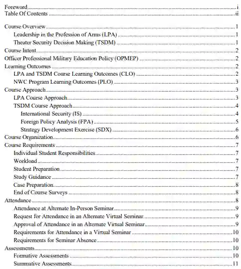 本课程面向中级军官及政府文职官员,旨在应对快速演变的国内外安全环境挑战。教学内容涵盖国家、区域及全球多层次安全议题,重点聚焦三大领域:(1)解析美国国家安全专业人员(特指作战司令部人员)所处当代安全环境的挑战与机遇;(2)剖析试图影响美国国家安全决策的多元行为体(国内外/政府与非政府),评估其行动动机及政策影响力;(3)基于安全环境认知与行为体影响机制研究,培养学员制定推进美国利益的战区级安全战略所需的研究、评估与规划能力。