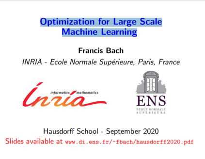 Francis Bach 先生是INRIA(法国国家信息与自动化研究所)的研究员,自2011年起领导SIERRA项目团队(该团队是Ecole Normale Supérieure计算机科学系的一部分,也是CNRS、ENS和INRIA的联合团队)。自2016年起,成为Ecole Normale Supérieure的兼职教授。在伯克利大学完成了计算机科学博士学位,与迈克尔·乔丹教授合作,在巴黎矿业大学数学形态学组工作了两年,然后从2007年到2010年加入了INRIA/Ecole Normale Superieure/CNRS的WILLOW项目组。从2009年到2014年,负责ERC项目SIERRA。对统计机器学习很感兴趣,特别是在图形模型、稀疏方法、基于核的学习、凸优化视觉和信号处理方面。