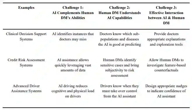 没有对这些文献进行系统性的回顾,而是综合了已经出现的一些见解,并将重点完全放在人工智能辅助决策的性能相关方面。具体来说,研究了人工智能协助人类管理者完成独立任务时影响决策准确性的三大挑战。首先,讨论了开发能够补充人类管理者能力的人工智能的必要性。当熟练的人工智能助手融入决策过程时,人类必须充分了解人工智能的能力和制约因素。其次,强调人类对人工智能精确心智模型的重要性。只有当人知道如何利用这种支持来提高人类-人工智能团队的绩效时,人工智能辅助才能充分发挥其潜力。第三,讨论了在人类与人工智能协同工作的不同工作流程中开发有效的人机交互方法所面临的挑战。这涉及确定何时提供人工智能协助和提供哪些信息,以及考虑人工智能系统适应人类认知局限性的需要。认为,认知建模有助于了解有效使用人工智能信息所面临的障碍。表 1 结合现实世界中的例子讨论了这三个挑战,包括临床决策支持、信用评估和高级驾驶辅助系统,在这些系统中,人工智能辅助决策正逐渐成为常态。