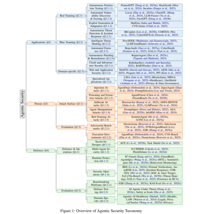我们将 LLM 智能体定义为:其核心决策模块为 LLM,能够进行规划,调用工具/API,并在外部环境中采取行动;同时观察反馈并据此调整后续动作。它维护状态(短/长时记忆或知识库),并可能包含显式的自我反思/自验证与治理层,以满足任务目标与安全约束。 这种新获得的“能动性”使 LLM-智能体在安全谱系上展现出惊人的能力(Shen 等,2025;Zhu 等,2025b;Lin 等,2025b)。然而,多项研究表明,仅仅将 LLM 包装进智能体框架这一行为,就会显著增加其脆弱性(Saha 等,2025;Kumar 等,2025;Chiang 等,2025)。对此,越来越多的研究着手提出对策以加固这些系统(Debenedetti 等,2025;Udeshi 等,2025)。 智能体安全研究的快速发展——仅 2024–2025 年间就有 150 余篇论文——造成了缺乏系统综合的碎片化格局。现有综述虽分别在安全威胁(Deng 等,2024c)、可信性(Yu 等,2025)、企业治理(Raza 等,2025)与核心 LLM 安全(Ma 等,2025)等具体方面提供了有价值的洞见,但如表 1 所示,它们未能呈现全景图。这种碎片化使实践者与研究者缺乏一个统一框架来理解智能体的能力、脆弱性与防御之间如何相互关联。 在本文中,我们提出首个关于智能体安全版图的全景式综述,并围绕安全研究者最关心的三个问题加以结构化:**“智能体能为我的安全做什么?”(应用),“它们会如何被攻击?”(威胁),以及“我如何阻止它们?”(防御)。**为此,我们定义了三大分类支柱: * 应用(§2):在下游网络安全任务中使用 LLM-智能体,包括红队(自主式漏洞发现)、蓝队(威胁防御)与特定领域安全(云、Web 等)。 * 威胁(§3):智能体系统所固有、可被攻击者利用的安全脆弱性。 * 防御(§4):用于抵御上述威胁、加固智能体系统的技术与对策。