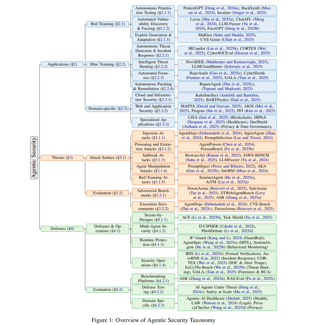 我们将 LLM 智能体定义为:其核心决策模块为 LLM,能够进行规划,调用工具/API,并在外部环境中采取行动;同时观察反馈并据此调整后续动作。它维护状态(短/长时记忆或知识库),并可能包含显式的自我反思/自验证治理层,以满足任务目标与安全约束。 这种新获得的“能动性”使 LLM-智能体在安全谱系上展现出惊人的能力(Shen 等,2025;Zhu 等,2025b;Lin 等,2025b)。然而,多项研究表明,仅仅将 LLM 包装进智能体框架这一行为,就会显著增加其脆弱性(Saha 等,2025;Kumar 等,2025;Chiang 等,2025)。对此,越来越多的研究着手提出对策以加固这些系统(Debenedetti 等,2025;Udeshi 等,2025)。 智能体安全研究的快速发展——仅 2024–2025 年间就有 150 余篇论文——造成了缺乏系统综合的碎片化格局。现有综述虽分别在安全威胁(Deng 等,2024c)、可信性(Yu 等,2025)、企业治理(Raza 等,2025)与核心 LLM 安全(Ma 等,2025)等具体方面提供了有价值的洞见,但如表 1 所示,它们未能呈现全景图。这种碎片化使实践者与研究者缺乏一个统一框架来理解智能体的能力、脆弱性与防御之间如何相互关联。 在本文中,我们提出首个关于智能体安全版图的全景式综述,并围绕安全研究者最关心的三个问题加以结构化:**“智能体能为我的安全做什么?”(应用),“它们会如何被攻击?”(威胁),以及“我如何阻止它们?”(防御)。**为此,我们定义了三大分类支柱: * 应用(§2):在下游网络安全任务中使用 LLM-智能体,包括红队(自主式漏洞发现)、蓝队(威胁防御)与特定领域安全(云、Web 等)。 * 威胁(§3):智能体系统所固有、可被攻击者利用的安全脆弱性。 * 防御(§4):用于抵御上述威胁、加固智能体系统的技术与对策。