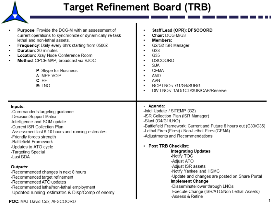 值得注意的是,TRB 并没有取代慎重的目标定位过程。目标定位工作组(TWG)和目标定位决策委员会(TDB)仍是指挥官批准优先目标的主要机制。相应地,TRB 也是 CUOP 的目标调整工具。已规划和安排的资源被调整为打击对手而非计划。