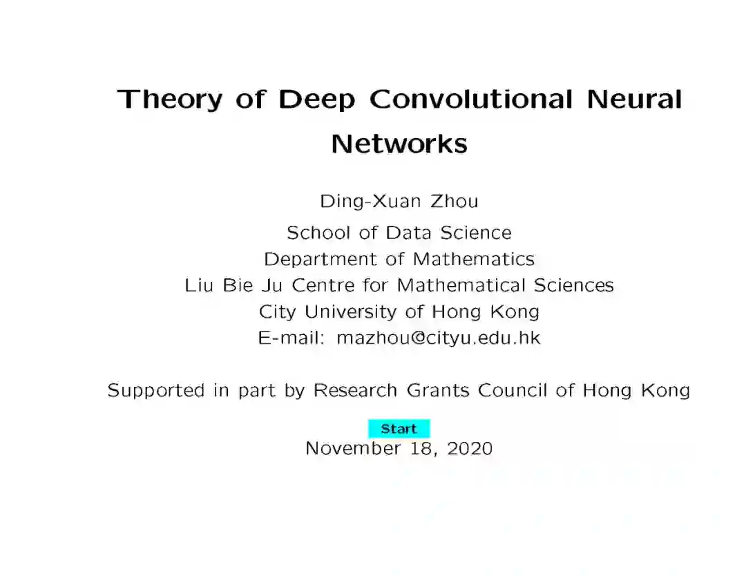 深度学习在语音识别、计算机视觉等许多领域得到了广泛的应用和突破。其中涉及的深度神经网络结构和计算问题已经在机器学习中得到了很好的研究。但对于理解深度学习模型在网络架构中的建模、逼近或泛化能力,缺乏理论基础。在这里,我们对具有卷积结构的深度卷积神经网络(CNNs)很感兴趣。convolutional architecture使得deep CNNs和fully connected deep neural networks有本质的区别,而30年前发展起来的关于fully connected networks的经典理论并不适用。本讲座介绍了深度神经网络的数学理论与整流线性单元(ReLU)激活函数。特别是,我们首次证明了深度CNN的普遍性,即当神经网络的深度足够大时,深度CNN可以用来逼近任意的连续函数,达到任意的精度。我们还给出了显式的逼近率,并表明对于一般函数,深度神经网络的逼近能力至少与全连接多层神经网络一样好,对于径向函数更好。我们的定量估计严格按照待计算的自由参数的数量给出,验证了深度网络神经网络处理大数据的效率。