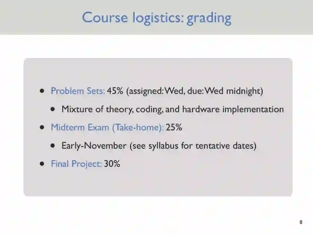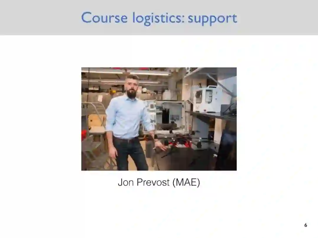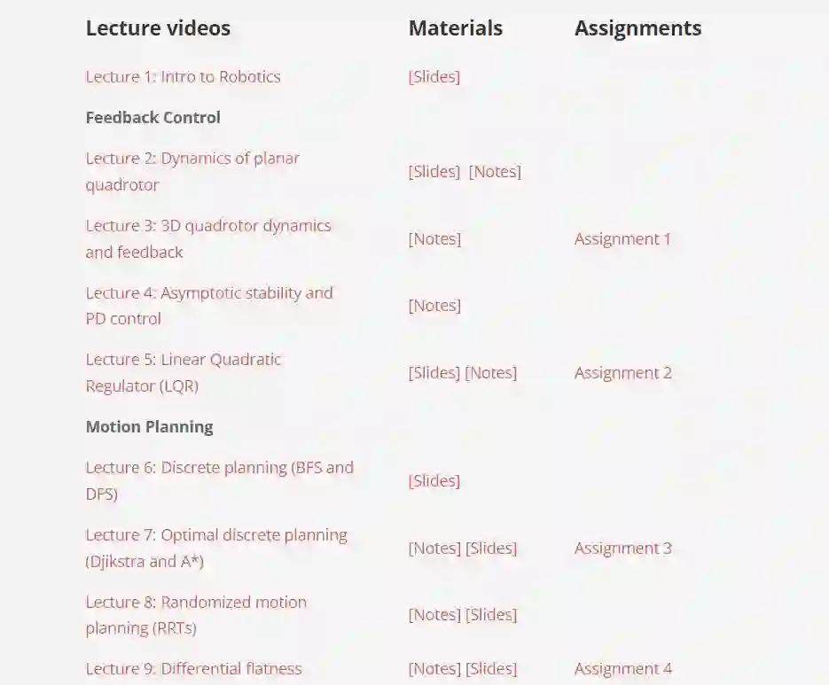 机器人技术是一个快速发展的领域,其应用包括无人驾驶飞行器、自动驾驶汽车和机器人操纵器。本课程将介绍机器人系统背后的基本理论和算法原理。该课程还将允许学生通过基于项目的作业与crazyfly四旋翼获得实践经验。主题包括: * 反馈控制 * 运动规划 * 状态估计、定位和映射 * 计算机视觉与学习 * 更广泛的主题:机器人与法律、伦理和经济学