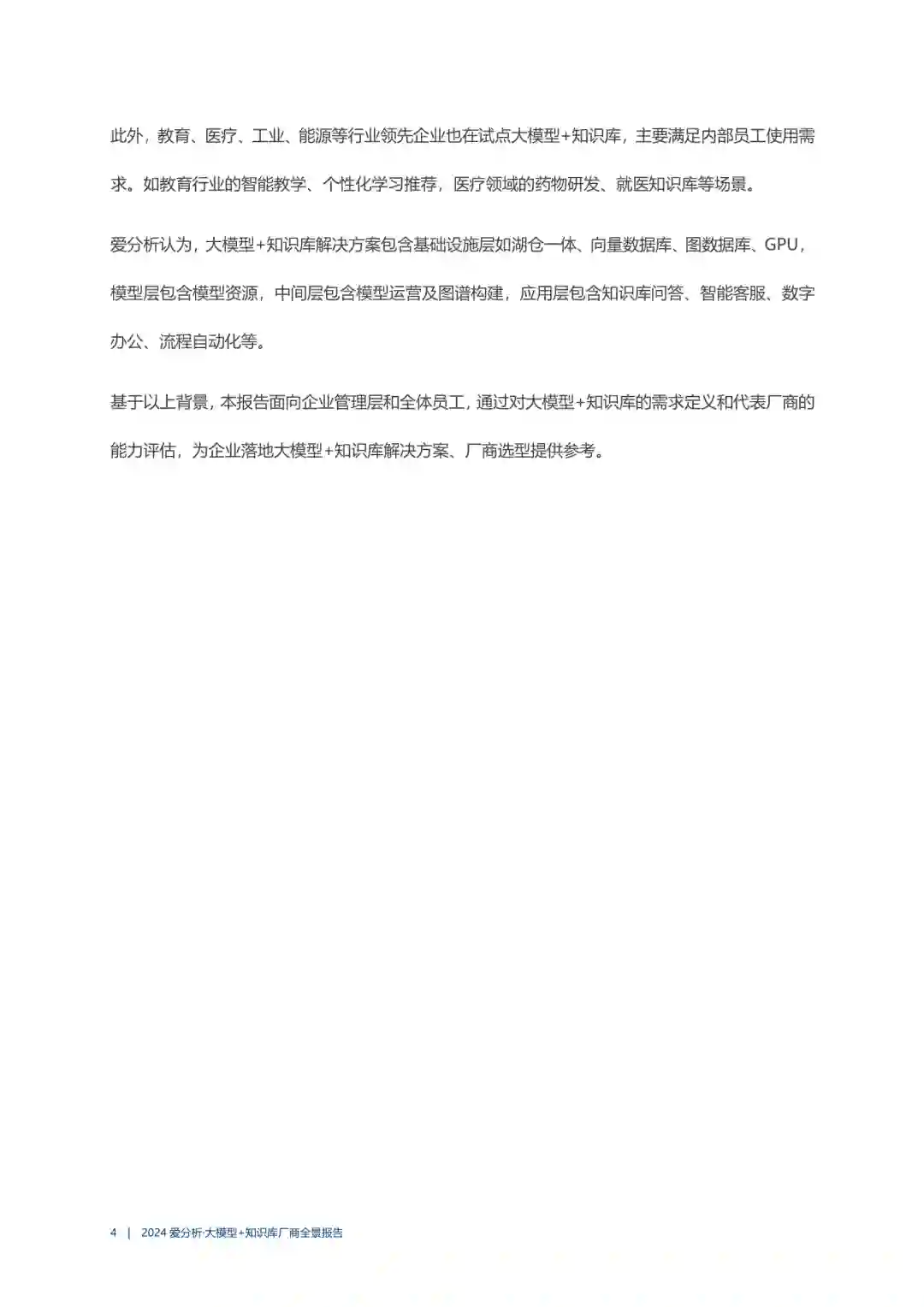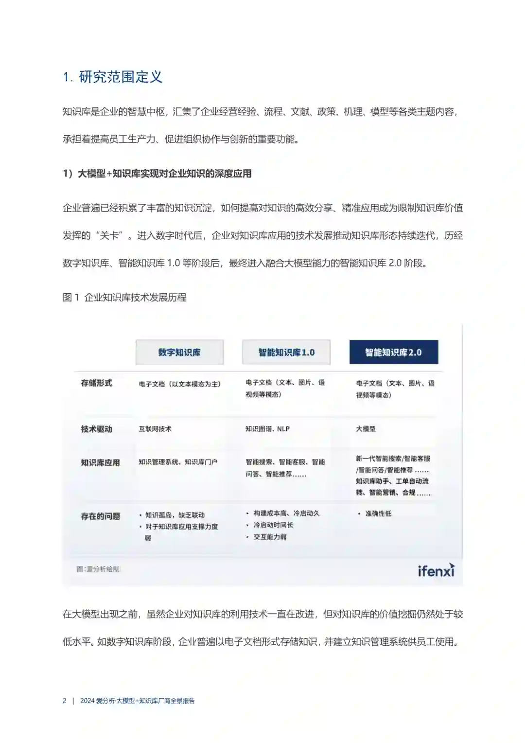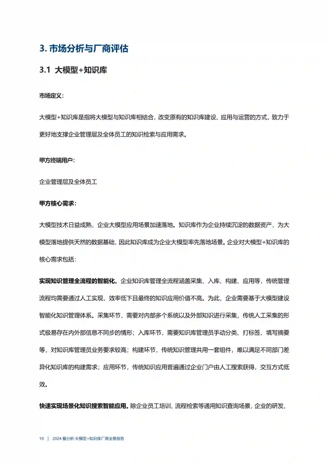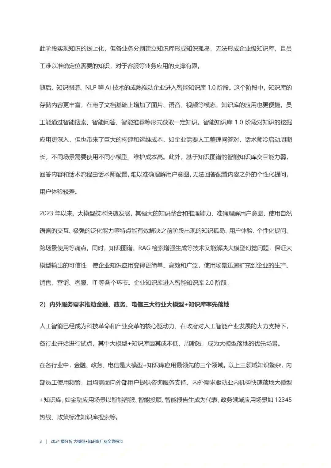 知识库是企业的智慧中枢,汇集了企业经营经验、流程、文献、政策、机理、模型等各类主题内容,承担着提高员工生产力、促进组织协作与创新的重要功能。 企业普遍已经积累了丰富的知识沉淀,如何提高对知识的高效分享、精准应用成为限制知识库价值发挥的“关卡”。进入数字时代后,企业对知识库应用的技术发展推动知识库形态持续迭代,历经数字知识库、智能知识库1.0等阶段后,最终进入融合大模型能力的智能知识库2.0阶段。大模型+知识库同时具备大模型强大的知识整合和推理能力、准确理解用户意图、使用自然语言的交互、极强的泛化能力,以及知识图谱、RAG检索增强生成等技术使企业知识应用变得更简单、高效和广泛。同时,大模型+知识库因其成本低、周期短,成为大模型落地的优先场景,并在金融、政务、电信三个领域中率先落地。这三领域知识繁杂,内部员工使用频繁,且均需面向外部用户提供咨询服务支持,内外需求驱动业内机构快速落地大模型+知识库,如金融应用场景以智能客服、智能投顾、智能报告生成为代表,政务领域应用场景如12345热线、政策标准知识库搜索等。