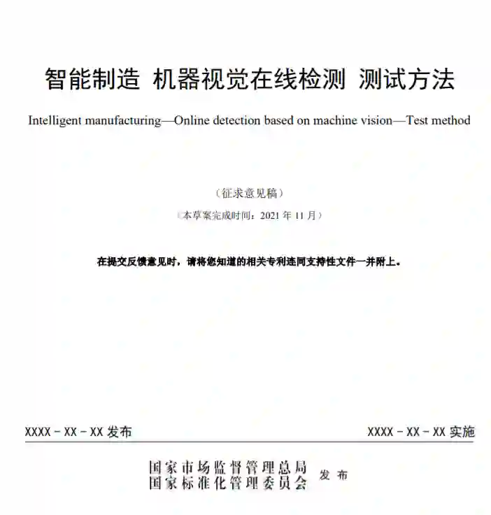 本文件通过对汽车、印刷、显示器件和电子等制造行业的调研,首先确 认了以机器视觉在线检测为对象的测试方法相关标准化需求。根据各行业的 标准化需求,结合机器视觉在线检测系统在开发、实施、使用过程中的通用 场景和技术路线,参考GB/T 40659-2021《智能制造 机器视觉在线检测系统 通用要求》相关技术要求,提出面向智能制造的机器视觉在线检测系统的测 试方法,包括集成测试、系统测试和互联互通测试,并在汽车、印刷、显示 器件和电子等制造行业的相关企业进行了验证。本文件规定了智能制造环境下机器视觉在线检测系统的测试方法,将帮 助设备、服务供应商和制造企业深入了解智能制造环境下机器视觉在线检测 功能和性能等相关的测试方法。本文件规定的内容可大大降低设备、服务供 应商和制造企业之间的沟通成本,统一大家的认知,可作为企业选择或评价 智能制造环境下机器视觉在线检测系统的依据。