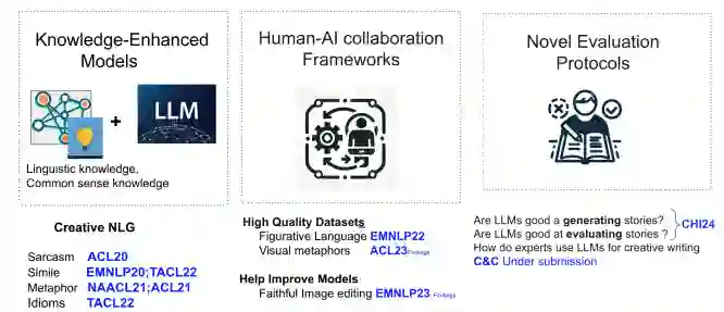 大语言模型(LLM)构成了自然语言处理与人工智能领域的范式转变。本文探索将创造力整合到人工智能系统中,以增强其与人类的交互。论述了使人工智能具备理解和生成超越字面意义、捕捉人类艺术与对话微妙之处的内容能力的必要性。为解决当前最先进人工智能模型在创造力方面的局限,本论文首先提出了一种开发无监督或弱监督机器学习模型的方法,该模型融入了隐性/常识知识。此方法通过利用外部常识知识源,实现创造性文本内容(如讽刺与隐喻)的生成。此外,讨论了为创造性任务训练人工智能而收集大规模高质量数据集的挑战,并提出了人类专家与最先进模型之间的协作努力以克服这些障碍。最后,倡导以人为中心的稳健评估方案,并展示了如何设计和开发此类方案,以便能在独立和交互式两种设置中更好地评估模型输出的创造力质量。强调现有模型的当前局限以及构建更优模型以实现高效可信的人机协作系统的未来方向作为本论文的结束。