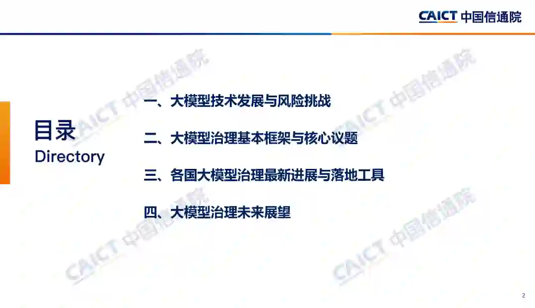 蓝皮报告首先分析了大模型技术变革引发的风险挑战,提炼出大模型治理基本框架;然后聚焦各方高度关注的四大议题,探讨相应制度方案,同时挖掘欧美等主要国家和地区在大模型治理领域最新动态趋势;最后聚焦到我国以事前备案、全流程评估、事后溯源检测为代表的大模型治理落地实践,期望为完善大模型治理体系提供有益参考。