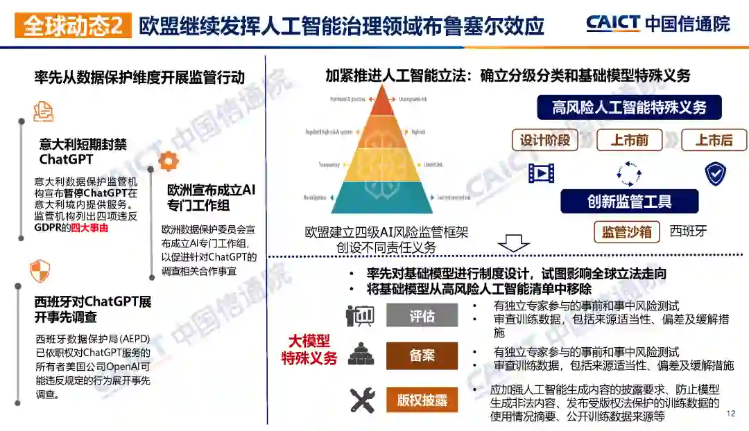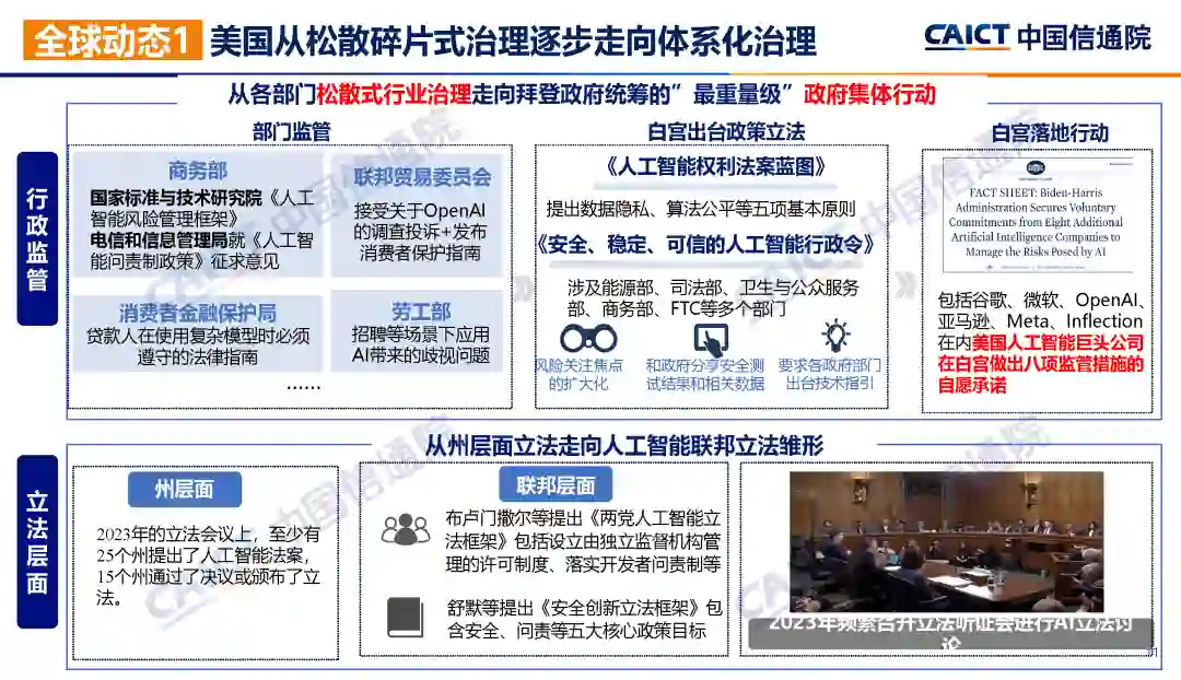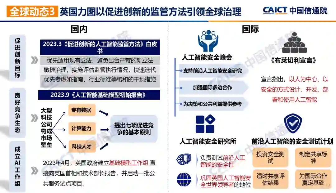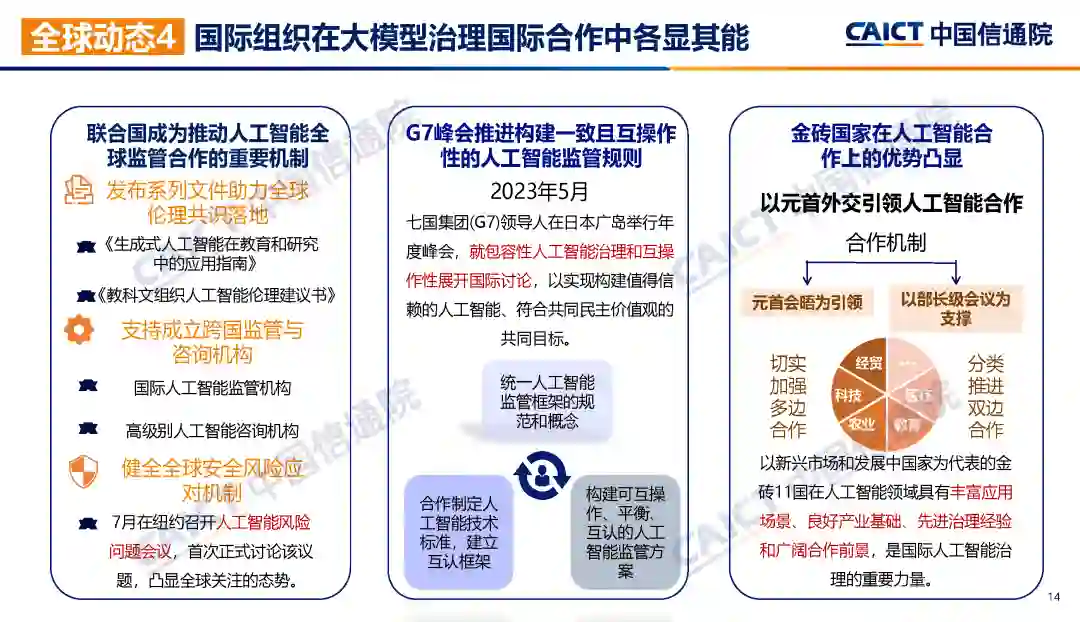 全球大模型治理体系加速构建。美国从各部门松散式行业治理走向拜登政府统筹的政府集体行动,总体仍体现“对内发展、对外竞争”的治理内核。欧盟继续发挥人工智能治理领域的布鲁塞尔效应,加紧推进《人工智能法案》的制定进程。英国力图以促进创新的监管方法引领全球治理,打造本土产业发展优势。联合国、G7和金砖等国际组织在大模型治理国际合作中各显其能,各有侧重推动大模型治理的国际化进程。