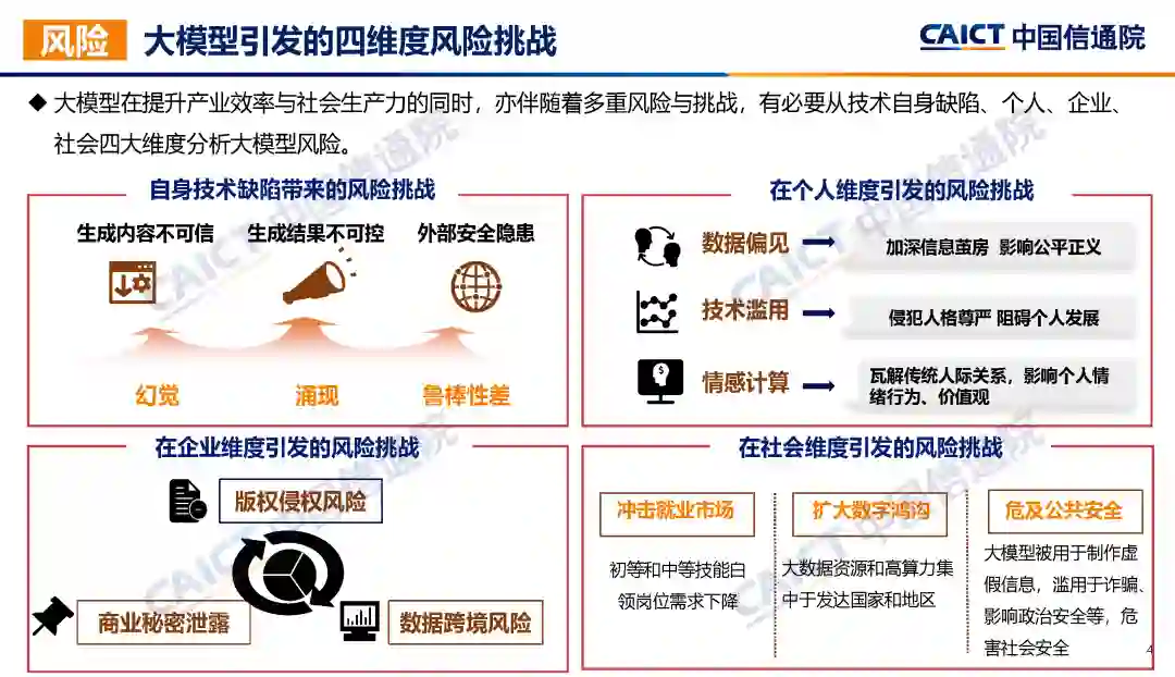 大模型基于大数据、大算力、多模态的技术优势,实现了从感知世界、理解世界向创造世界的跃迁,成为内容生产方式的“颠覆者”、通用人工智能的“先行者”、人机交互的“协作者”。技术变革的同时带来四维度风险挑战,大模型幻觉、涌现效应等加剧模型自身风险,大模型技术滥用、情感计算等侵犯个人人格尊严,大模型版权侵权、数据泄露等危及企业商业秘密等利益,同时在就业替代、加深数字鸿沟等方面冲击社会稳定。