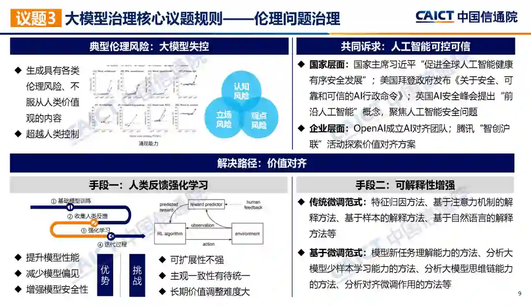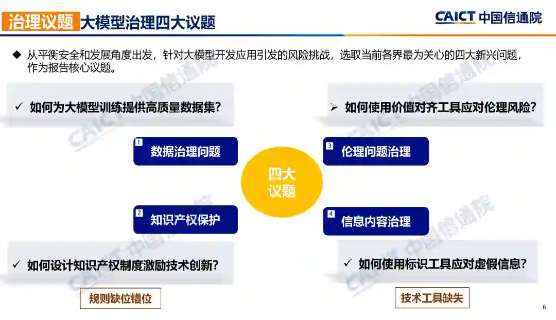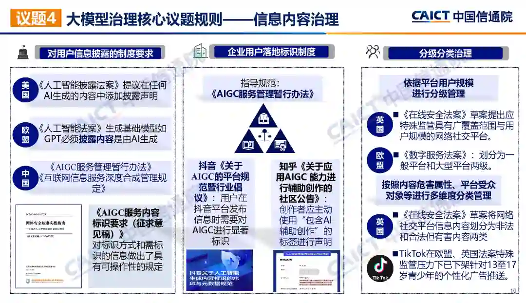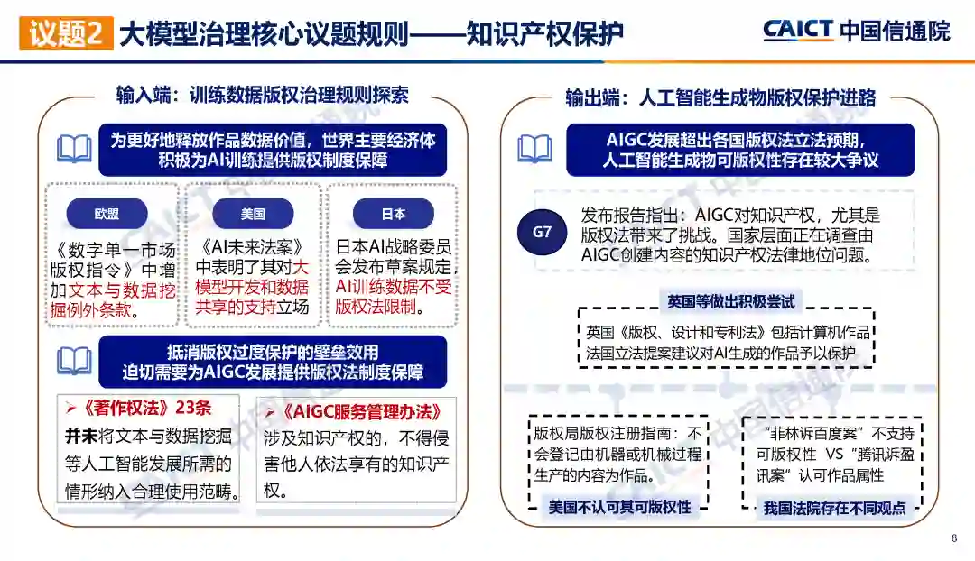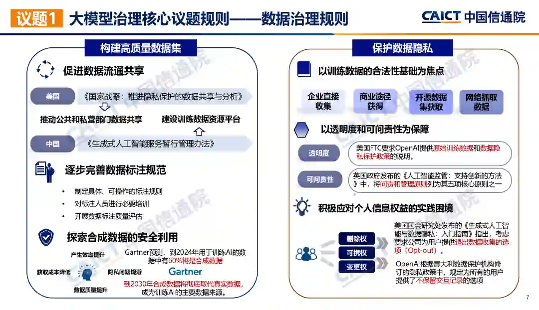 一是探索数据治理规则,构建高质量训练数据。关注数据流通共享、数据标注、合成数据应用等,积极探索数据来源合法性基础、透明度保障、删除权等权利困境。二是创新知识产权保护,优化从训练数据的输入端的版权治理到人工智能生成物输出端的版权保护,激励技术创新。三是探索大模型伦理治理应对策略,探索RLHF、解释性等价值对齐方案,确保大模型可控可信。四是强调信息内容治理,标识工具和平台责任成为信息内容治理的主要抓手。