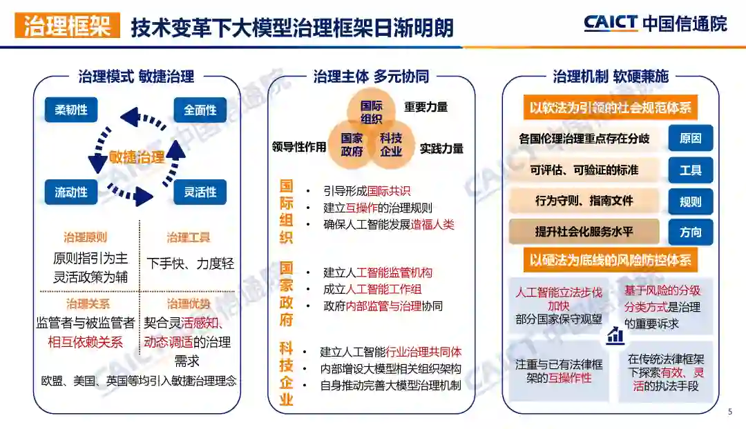 (一)治理模式:敏捷治理成为国际较为通行的治理方案 (二)治理主体:激励多元主体协同治理成为全球共识 (三)治理机制:软硬兼施推进大模型治理