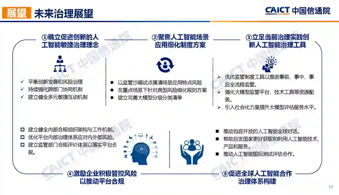 (一)确立促进创新的人工智能敏捷治理理念 (二)聚焦人工智能场景应用细化制度方案 (三)立足当前治理实践创新人工智能治理工具 (四)激励企业积极管控风险以推动平台合规 (五)促进全球人工智能合作治理体系构建