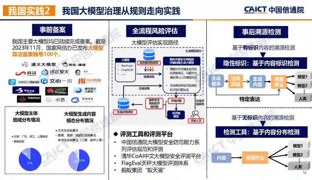 事前阶段,我国通过备案制度推进大模型实现面向监管的透明度,报告梳理了备案要求和备案现状。在风险动态管控方面,我国主张全流程安全评估,各界积极推进安全评估标准化、智能化,目前学界业界发布了各类评测工具和评测平台,但存在评价方式、标准不统一、评估结果差异大等问题。事后溯源检测方面,我国探索基于隐式标识的检测、基于内容分布的检测等技术工具,实现细粒度来源追踪和责任追溯。