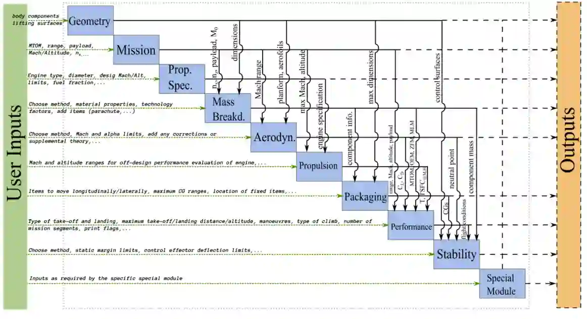 GENUS 核心框架由九个基本模块组成,其中包括 1. 几何 2. 任务 3. 推进规范 4. 质量分解 5. 空气动力学 6. 推进分析 7. 包装 8. 性能 9. 稳定性