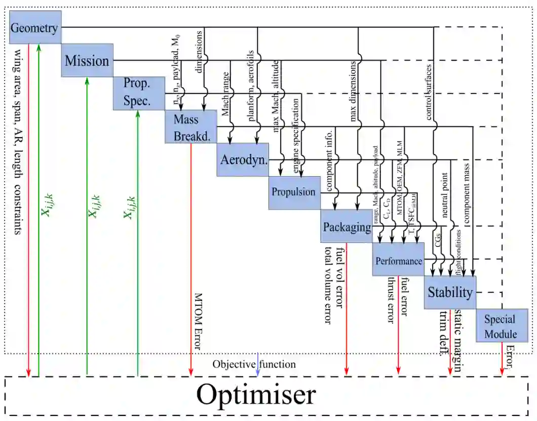 图 3-7 显示了带有几何和体积约束、质量和燃料收敛误差以及推力和稳定性约束的优化循环的 N2 图。输入变量仅与几何、任务(估计起飞质量)和推进规范模块相对应。该图表示一个固定飞行任务(航程、速度、有效载荷......)的典型收敛优化循环。目标函数箭头来自框架域,一般代表可选择的各种目标;典型目标函数的例子包括最大起飞质量 (MTOM)、运行空重 (OEM)、总耗油量、RCS(特定视角或平均值)等。