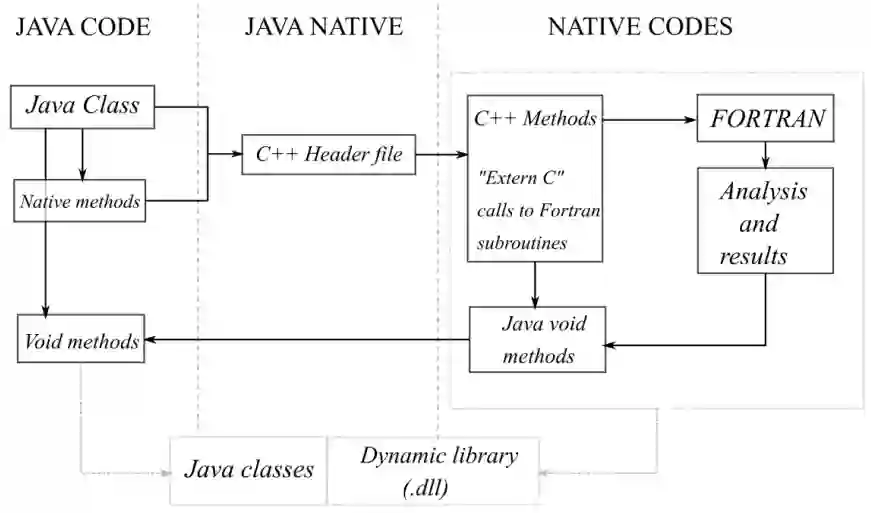 另一个重要特点是 Java 能够通过其 Java 本地接口 (JNI) 实现与 FORTRAN 和 C/C++ 等其他编程语言进行通信。图 3-2 显示了 Java 与传统飞机设计代码(通常用 C、C++ 和 FORTRAN 编写)之间的集成和通信过程。该功能广泛应用于 GENUS 框架的各个分析学科,以增加保真度,而无需长时间重写或独立开发复杂代码。