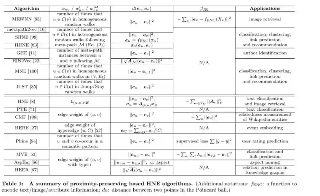 如前所述,网络嵌入的一个基本目标是捕获网络拓扑信息。这可以通过在节点之间保留不同类型的邻近性来实现。在HNE中,有两类主要的接近性保护方法:基于随机步法的方法(灵感来自DeepWalk[49])和基于一阶/二阶接近性的方法(灵感来自LINE[72])。
