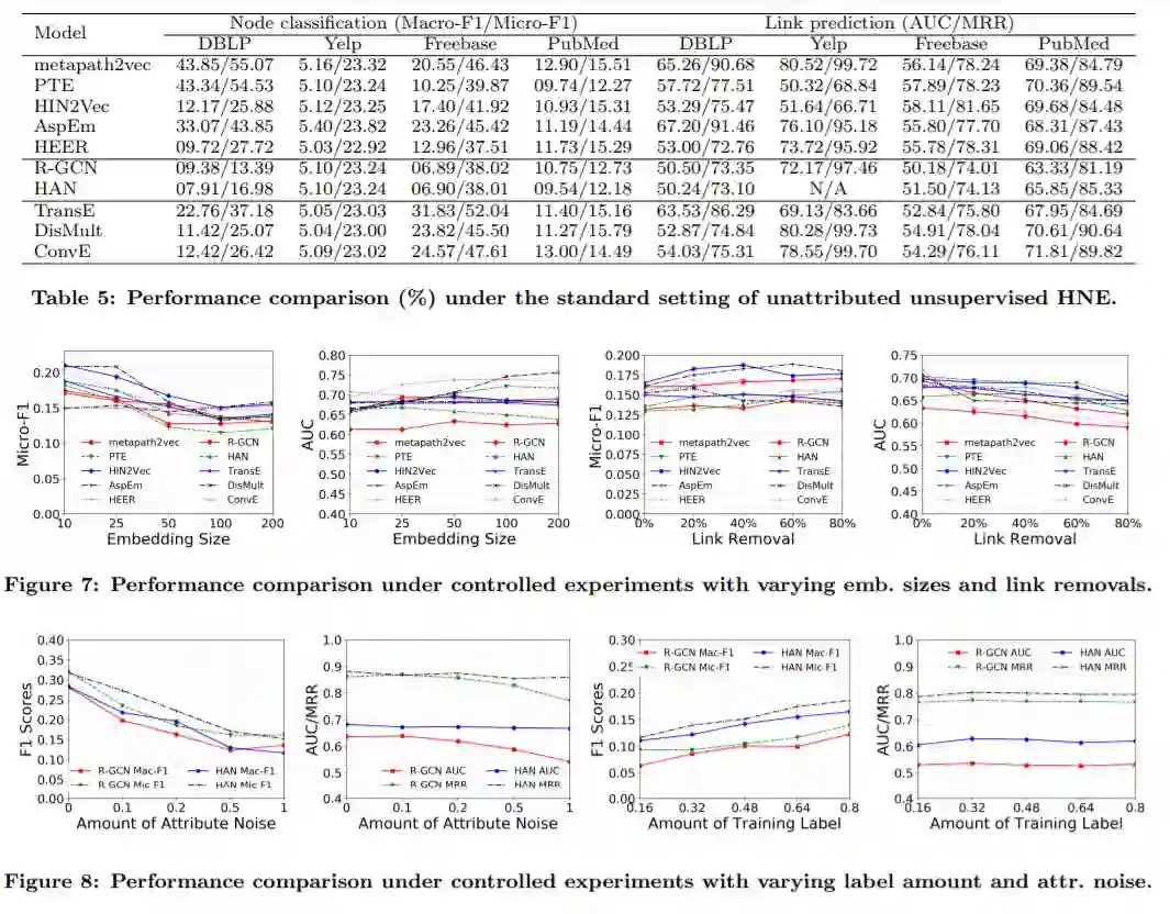 作为第三个贡献,许多现有的HNE算法(包括一些非常流行的算法)要么没有一个灵活的实现(例如,硬编码的节点和边缘类型、固定的元路径集等),要么不能扩展到更大的网络(例如,在训练期间的高内存需求),这给新的研究增加了很多负担(例如,,在正确的重新实现中需要大量的工程工作)。为此,我们选择了10种流行的HNE算法,在这些算法中,我们仔细地重构和扩展了原始作者的实现,并为我们准备好的数据集的插件输入应用了额外的接口(第5节)。基于这些易于使用和有效的实现,我们对算法进行了全面的经验评估,并报告了它们的基准性能。实证结果在提供了与第3节的概念分析相一致的不同模型的优点的同时,也为我们的基准平台的使用提供了范例,以供今后对HNE的研究参考。