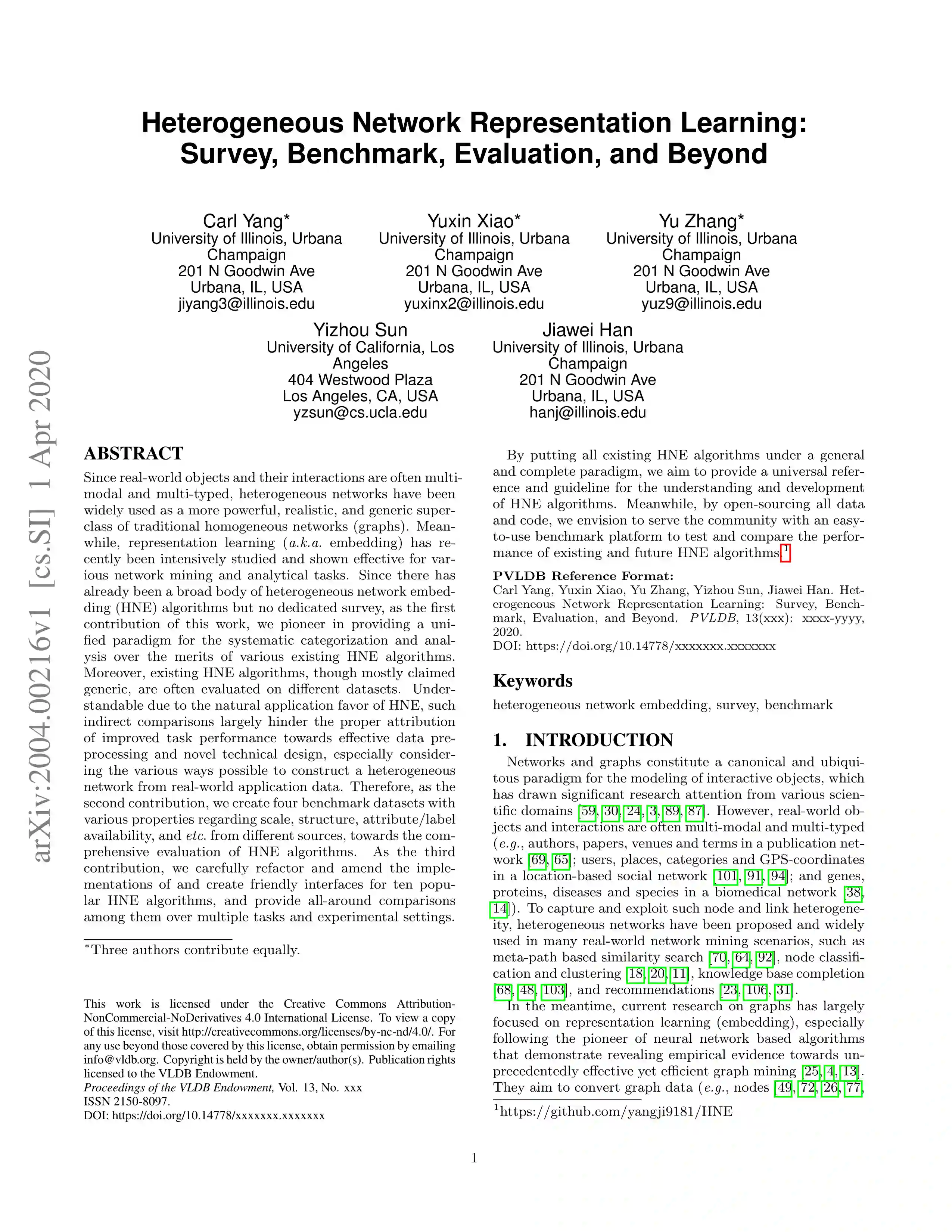 网络和图形构成了一种规范的、普遍存在的交互对象建模范式,已经引起了各个科学领域的重要研究关注[59、30、24、3、89、87]。然而,现实世界的对象和交互通常是多模态和多类型的(例如,作者、论文、场所和出版物网络中的术语[69,65];基于位置的社交网络中的用户、地点、类别和gps坐标[101,91,94];以及生物医学网络中的基因、蛋白质、疾病和物种[38,14])。为了捕获和利用这种节点和链路的异构性,异构网络被提出并广泛应用于许多真实的网络挖掘场景中,如基于元路径的相似度搜索[70、64、92]、节点分类和聚类[18、20、11]、知识库补全[68、48、103]和推荐[23、106、31]。