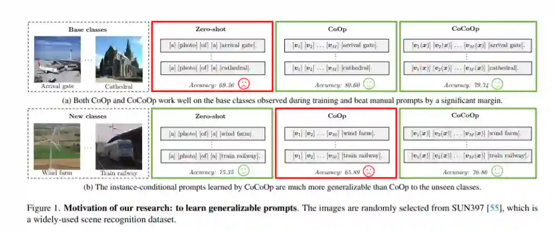随着功能强大的预训练视觉语言模型(如CLIP)的兴起,研究如何使这些模型适应下游数据集变得非常必要。最近提出的一种名为上下文优化(CoOp)的方法将提示学习的概念引入视觉领域,以适应预训练的视觉语言模型。具体来说,CoOp将提示中的上下文单词转换为一组可学习的向量,并且仅使用少量标记的图像进行学习,可以在经过大量调整的手动提示中实现巨大的改进。在我们的研究中,我们确定了CoOp的一个关键问题: 学习的上下文不能泛化到同一数据集内更广泛的不可见类,这表明在训练期间观察到的CoOp基类过拟合。 为了解决这个问题,我们提出了条件上下文优化(CoCoOp),它通过进一步学习一个轻量级神经网络来为每幅图像生成一个输入条件标记(向量)来扩展CoCoOp。与CoOp的静态提示相比,我们的动态提示适应每个实例,因此对类迁移不那么敏感。大量的实验表明,对于不可见的类,CoCoOp的泛化效果要比CoOp好得多,甚至在单个数据集之外还显示出很好的可迁移性; 具有较强的域泛化性能。代码可在https://github.com/ KaiyangZhou/CoOp