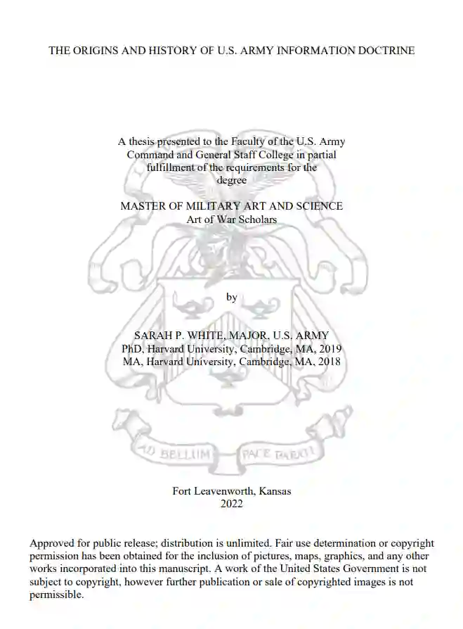 这篇论文探讨了美陆军信息战令人困惑的历史,以了解为什么持久的信息条令被证明是如此难以捉摸。论文认为,陆军信息条令的发展分为三个阶段,每个阶段都对应着一系列独特的战略、组织和技术挑战。内部的组织动态,而不是外部的战略一致性,是决定信息学说在历史上任何特定时刻的成败的主要因素。未来的信息条令,包括目前的ADP 3-13草案的未来迭代,必须以认可陆军组织利益的复杂性方式来解决陆军的核心战略挑战,而且必须通过一个概念来实现,其有效性是可见的、可衡量的和令人信服的。
