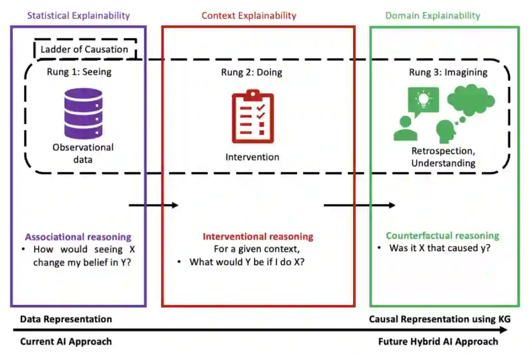 图1 网络和医疗保健中的因果AI:从基于数据表示和关联支持的统计解释性,到基于因果关系和干预支持的情境解释性,最后导向基于知识图谱中的因果表示的领域解释性,从而得到反事实支持。CCS概念:• 人工智能 → 因果AI; • 机器学习 → 解释性; • 自然语言理解; • 本体论 → 知识图谱;