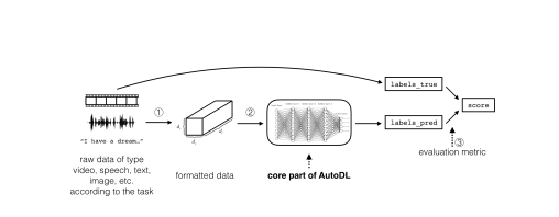 图1.1 AutoDL挑战中的数据流。不同类型(视频、语音、文本等)的数据首先被统一为基于张量的格式,然后传递给AutoDL的核心部分,该部分应用一种单一的学习算法,并试图在评估指标方面使学习性能最大化。