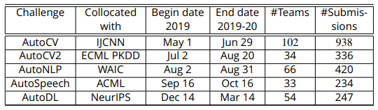 由于我们意识到AutoDL这一目标的雄心和挑战性,我们将这一挑战分为几个小的挑战,每个挑战涉及一个领域/模式。这些挑战是AutoCV(图像)、AutoCV2(图像+视频)、AutoNLP(文本)、AutoSpeech(音频),最后是AutoDL(所有组合)。表1.1显示了参与AutoDL挑战的情况和一些基本事实。这些挑战清楚地定义了什么是AutoDL问题,为社区提供了一个拥有100个数据集的开源基准测试平台,并帮助推动该领域的最先进技术。