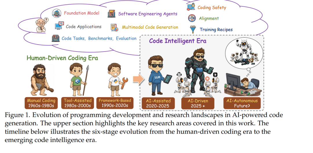 4. 评测体系批判性评估:全面评述现有基准测试与评估方法,讨论其优势与局限,并聚焦于从“功能正确性”向“代码质量、可维护性与效率”等多维评估的演进挑战;