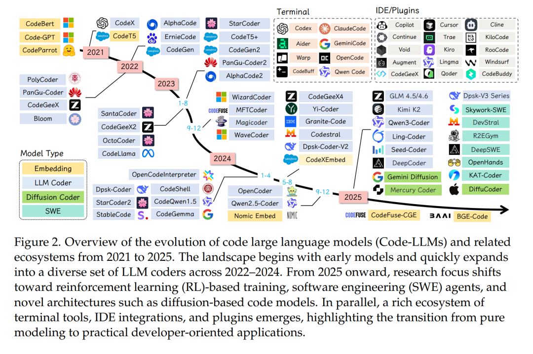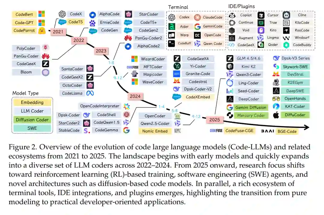 大型语言模型(Large Language Models, LLMs)[66, 67, 192, 424, 435, 750, 753, 755, 756] 的兴起推动了自动化软件开发的范式变革,从根本上重构了人类意图与可执行代码之间的关系 [1306]。现代 LLM 在各类代码相关任务中展现出卓越能力,包括代码补全 [98]、代码翻译 [1158]、代码修复 [619, 970] 以及代码生成 [139, 161]。这些模型有效地将多年积累的编程专业知识提炼为易于使用的、可遵循指令的工具,使不同技能水平的开发者均可利用来自 GitHub、Stack Overflow 及其他代码相关网站的数据进行开发。 在 LLM 所支持的各类任务中,代码生成尤为具有变革性——它能够将自然语言描述直接转化为功能完备的源代码,从而消解了领域知识与技术实现之间的传统壁垒。这一能力已超越学术探索阶段,通过一系列商业与开源工具转化为现实生产力,包括:(1) GitHub Copilot(微软)[321],在集成开发环境中提供智能代码补全;(2) Cursor(Anysphere)[68],一款以 AI 为核心的代码编辑器,支持对话式编程;(3) CodeGeeX(智谱 AI)[24],支持多语言代码生成;(4) CodeWhisperer(亚马逊)[50],与 AWS 服务深度集成;(5) Claude Code(Anthropic)[194] 与 Gemini CLI(Google)[335],均为命令行工具,允许开发者直接在终端中将编码任务委托给 Claude 或 Gemini [67, 955],以支持智能体驱动的编程工作流。这些应用不仅重塑了软件开发流程,也挑战了关于编程生产力的传统假设,并重新定义了人类创造力与机器辅助之间的边界。 如图 1 所示,代码生成技术的发展轨迹呈现出一条清晰的技术成熟与范式演进路径。早期方法受限于启发式规则与基于概率语法的框架 [42, 203, 451],其本质脆弱——仅适用于狭窄领域,难以泛化至丰富多样的编程场景。基于 Transformer 的架构 [291, 361] 的出现并非简单的性能提升,而是一次对问题空间的根本性重构,通过注意力机制 [997] 与模型规模,精准捕捉自然语言意图与代码结构之间的复杂关联。尤为引人注目的是,这些模型展现出的指令跟随能力并非显式编程或直接优化的结果,表明将高层目标转化为可执行实现的能力,可能是大规模学习丰富表征的自然产物。这种“编程民主化”[138, 864]——使非专家用户也能通过自然语言生成复杂程序——对 21 世纪的劳动力发展、创新节奏乃至计算素养的本质均具有深远影响 [223, 904]。 当前代码 LLM 领域呈现出通用模型与专用模型并行发展的战略分化,各具优势与权衡。以 GPT [747, 750, 753]、Claude [66, 67, 192] 和 LLaMA [690, 691, 979, 980] 系列为代表的通用大模型,通过融合海量自然语言与代码语料,建立起对上下文、意图和领域知识的细腻理解;而 StarCoder [563]、Code LLaMA [859]、DeepSeek-Coder [232]、CodeGemma [1295] 与 QwenCoder [435, 825] 等专用代码模型,则通过对编程中心化数据的聚焦预训练与任务导向的架构优化,在代码专项基准测试中取得更优性能。在 HumanEval [161] 等标准化基准上,模型成功率从个位数跃升至 95% 以上,既体现了算法创新,也反映了对代码本质更深层次的理解。尽管代码具有高度形式化特征,但其在组合语义与上下文依赖等方面与自然语言存在共性。 尽管学术研究活跃且商业化进程迅速,当前文献仍存在创新广度与系统性分析深度之间的显著鸿沟。现有综述多采用全景式视角,或涵盖广泛的代码任务类别,或聚焦于早期模型,未能充分整合最新进展。尤其缺乏深入探讨的是前沿系统所采用的复杂数据构建策略——如何在数据规模与质量之间取得平衡,以及如何通过指令微调使模型行为与开发者意图对齐。此类对齐技术包括:引入人类反馈以优化输出、采用高级提示范式(如思维链推理 [chain-of-thought] 与少样本学习)、构建具备多步问题分解能力的自主编程智能体、采用检索增强生成(Retrieval-Augmented Generation, RAG)方法将输出锚定于权威参考,以及开发超越简单二元正确性、评估代码质量、效率与可维护性的新型评测框架。 如图 2 所示,Kimi-K2 [957]、GLM-4.5/4.6 [25, 1248]、Qwen3Coder [825]、Kimi-Dev [1204]、Claude [67]、Deepseek-V3.2-Exp [234] 与 GPT-5 [753] 等最新 LLM 正是上述创新的集大成者,但其贡献仍散见于各类独立发表的研究,缺乏系统整合。表 1 对比了多篇关于代码智能或 LLM 的综述,从八个维度进行评估:领域范围、是否聚焦代码、是否使用 LLM、预训练、监督微调(Supervised Fine-Tuning, SFT)、强化学习(Reinforcement Learning, RL)、代码 LLM 的训练方案(Training Recipes)以及应用场景。这些综述覆盖了通用代码生成、基于生成式 AI(GenAI)的软件工程、代码摘要和基于 LLM 的智能体等多个方向。尽管多数综述关注代码及其应用,但在技术细节覆盖上差异显著:部分涉及 LLM 与预训练,但极少涵盖强化学习方法。 本文旨在对面向代码智能的大型语言模型研究进行全面且前沿的整合,系统考察模型全生命周期,涵盖从初始数据构建与指令微调,到高级代码应用及自主编程智能体开发的关键阶段。为提供从代码基础模型到智能体与应用的全面且实用的研究指南,我们构建了一个连接理论基础与现代代码生成系统实现的详细框架(如表 1 所示)。本文的主要贡献包括: