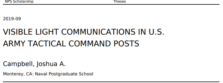 传统的无线网络,如使用无线电频率传输数据的无线保真(Wi-Fi),由于不容易被控制,增加了网络传输被敌军发现或操纵的几率,因此并不可取。一个潜在的解决方案是使用可见光通信(VLC)或 LiFi 在 TCPs 中提供局域网(LAN)连接。本论文试图根据美国陆军指挥所的作战要求和环境,确定 VLC 是否是有线网络的可行替代方案。