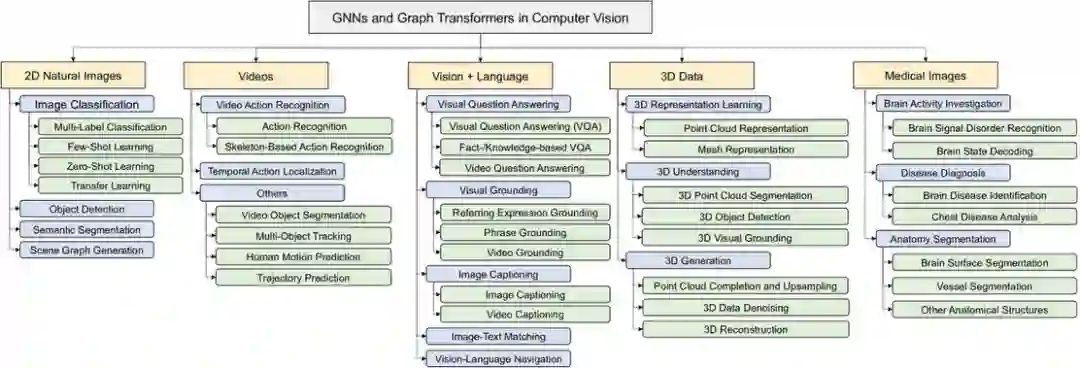 在本文中,我们首先介绍了图神经网络的发展史和最新进展,包括最常用、最经典的图神经网络和图 Transformers。然后,我们以任务为导向对计算机视觉中基于图神经网络(包括图 Transformers)的方法和最新进展进行了全面且详细的调研。具体来说,我们根据输入数据的模态将图神经网络在计算机视觉中的应用大致划分为五类:**自然图像(二维)、视频、视觉 + 语言、三维数据(例如,点云)以及医学影像。**在每个类别中,我们再根据视觉任务的不同对方法和应用进一步分类。这种以任务为导向的分类法使我们能够研究不同的基于图神经网络的方法是如何处理每个任务的,以及较为公平地比较这些方法在不同数据集上的性能,在内容上我们同时还涵盖了基于 Transformers 的图神经网络方法。对于不同的任务,我们系统性地总结了其统一的数学表达,阐明了我们组织这些文章的逻辑关系,突出了该领域的关键挑战,展示了图神经网络在应对这些挑战的独特优势,并讨论了它的局限和未来发展路线。